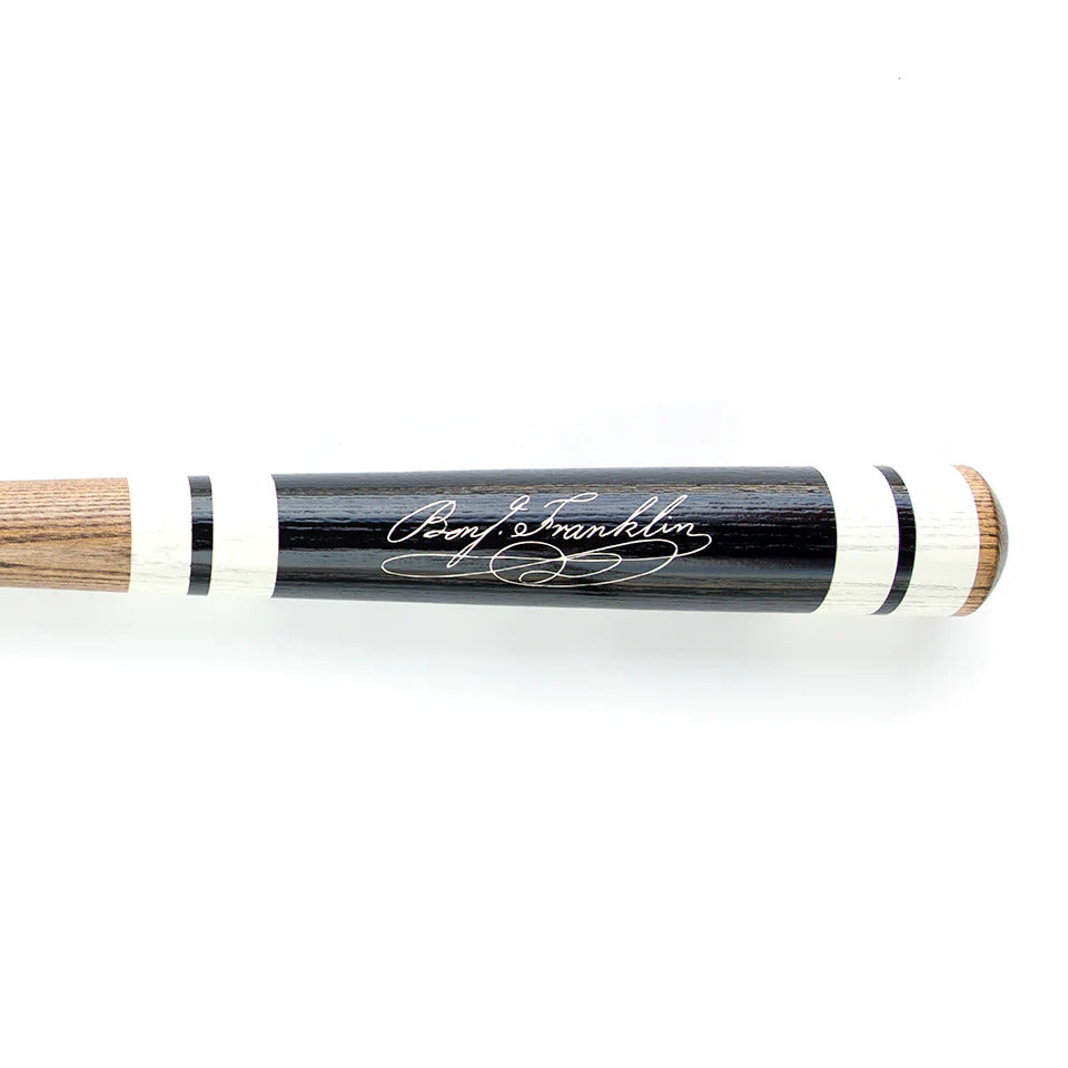 This bat is more than just a piece of art - it's a piece of American history. It features the iconic "Join or Die" segmented snake graphic designed by Benjamin Franklin, on one side of the barrel, with his signature on the other. This symbol has been a timeless rallying cry for unity and freedom throughout the centuries.